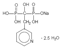 Actonel (risedronate sodium tablets) is a pyridinyl bisphosphonate that inhibits osteoclast-mediated bone resorption og modulates bone metabolism. Each Actonel tablet in the Actonel with Kalcium (risedronate sodium with calcium carbonate) co-package contains the equivalent of 35 mg of anhydrous risedronate sodium in the form of the hemi-pentahydrate with small amounts of monohydrate. The empirical formula for risedronate sodium hemi-pentahydrate is C 7 H 10 INGEN 7 P 2 Til • 2,5 timer 2 O. Det kemiske navn på Risedronate natrium er [1-hydroxy-2- (3-pyridinyl) ethyliden] bis [phosphonsyre] monosodiumsalt. Den kemiske struktur af Risedronate natrium hemi-pentahydrat er følgende: