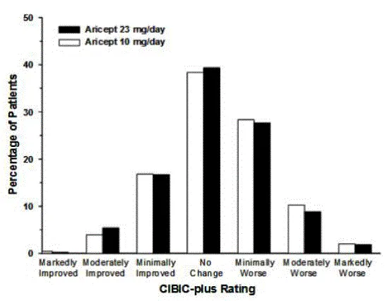De effectiveness of Aricept 23 mg/day as a treatment for moderate to severe Alzheimer’s disease has been demonstrated by the results of a randomized double-blind controlled clinical investigation in patients with moderate to severe Alzheimer’s disease. De controlled clinical study was conducted globally in patients with probable Alzheimer’s disease diagnosed by NINCDS-ADRDA and DSM-IV criteria MMSE: range of 0-20. Patients were required to have been on a stable dose of Aricept 10 mg/day for at least 3 months prior to screening. One thousand four hundred and thirty four (1434) patients with moderate to severe Alzheimer’s disease were randomized to 23 mg/day or 10 mg/day. De mean age of patients was 73.8 years with a range of 47 to 90. Approximately 63% of patients were women and 37% were men. Approximately 36% of the patients were taking memantine throughout the study.
