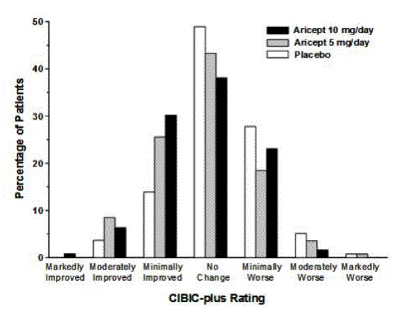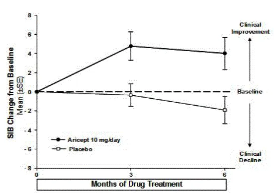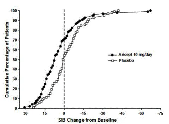 Figur 8 illustrerer de kumulative procentdele af patienter fra hver af de to behandlingsgrupper, der nåede målet for forbedring i SIB-score vist på X-aksen. Mens patienter, der blev tildelt både Aricept og til placebo, har en lang række responser, viser kurverne, at Aricept -gruppen er mere tilbøjelig til at vise en større forbedring af kognitiv ydelse.