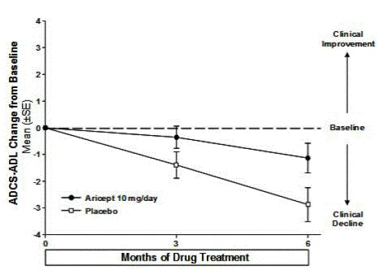 Figur 9 illustrerer tidsforløbet for ændringen fra baseline i ADCS-ADL-svær-scoringer for patienter i de to behandlingsgrupper i løbet af de 6 måneder af undersøgelsen. Efter 6 måneders behandling var den gennemsnitlige forskel i ADCS-ADL-svær ændringsresultater for Aricept-behandlede patienter sammenlignet med patienter på placebo 1,8 point. Aricept -behandling var statistisk signifikant overlegen end placebo.