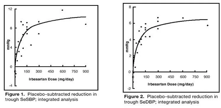De 7 undersøgelser af irbesartansk monoterapi omfattede i alt 1915 patienter randomiseret til Irbesartan (1 € 900 mg) og 611 patienter randomiseret til placebo. En gang dagligt doser på 150 mg og 300 mg gav statistisk og klinisk signifikante fald i systolisk og diastolisk blodtryk med trug (24 timer efter dosis) efter 6 til 12 ugers behandling sammenlignet med placebo på henholdsvis ca. 8. Der blev ikke set nogen yderligere stigning i virkningen ved doseringer over 300 mg. Dosis-respons-forholdet for effekter på systolisk og diastolisk tryk er vist i figur 1 og 2.