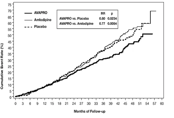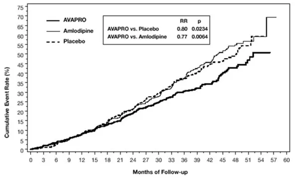 Det gennemsnitlige blodtryk opnåede var 142/77 mmHg for avapro 142/76 mmHg for amlodipin og 145/79 mmHg for placebo. Samlet set modtog 83,0% af patienterne måldosis af Irbesartan mere end 50% af tiden. Patienter blev fulgt i en gennemsnitlig varighed på 2,6 år.