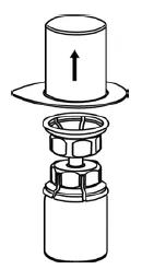 - Placer fortyndingsmættet på en flad overflade og hold hætteglasset tæt. Grib den mix2viale overførsel, der er indstillet sammen med den klare pakke, og skub plastspidsen i den blå ende af mix2Vial -overførselssættet fast gennem midten af stopperen af det fortyndede hætteglas (figur 2).