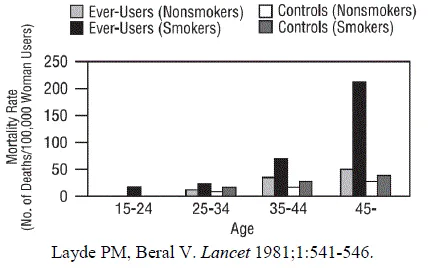 I ovenstående tabel er risikoen for død som følge af enhver præventionsmetode mindre end risikoen for fødsel bortset fra orale præventionsbrugere over 35 år, der ryger og piller brugere over 40 år, selvom de ikke ryger. Det kan ses i tabellen, at for kvinder i alderen 15 til 39 år var risikoen for død højest med graviditet (7 til 26 dødsfald pr. 100000 kvinder afhængigt af alder). Blandt pillebrugere, der ikke ryger, var risikoen for død altid lavere end den, der var forbundet med graviditet for nogen aldersgruppe mindre end 40. I en alder af 40 stiger risikoen til 32 dødsfald pr. 100000 kvinder sammenlignet med 28 dødsfald forbundet med graviditet i den aldersgruppe. For pillebrugere, der ryger og er over 35 år, overstiger det estimerede antal dødsfald dem, der er forbundet med graviditet. Hvis en kvinde er over 40 år og ryger hendes estimerede dødsrisiko er fire gange højere (117/100000 kvinder) end den estimerede risiko forbundet med graviditet (28/100000 kvinder) i den aldersgruppe.