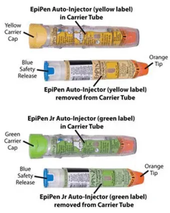 - Bær altid dine 2 rigtige gule epipen eller ægte grønne epipen JR auto-injektorer i tilfælde af en allergisk nødsituation.