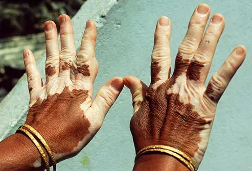 Vitiligo is a condition that creates loss of pigment in patches on the skin. People who have blue eyes are less likely to get vitiligo than those who have brown eyes. Researchers think it may be because genes responsible for blue eyes are linked to decreased risk of getting the condition.