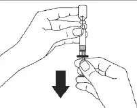 Trin 6. Hold hætteglas og sprøjte sammen med nålen, der stadig indsættes i hætteglasset. Drej forsigtigt hætteglasset og sprøjten sammen på hovedet. Træk forsigtigt ned på stemplet og trækker langsomt al væsken ud i sprøjten ( Se figur g ).