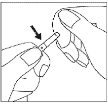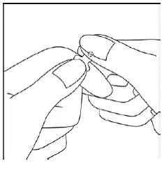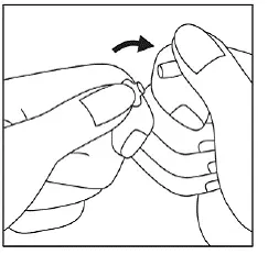 - At holde tommelfingeren på det farvede punkt og med pegefingrene tæt sammen, påfører det fast tryk på det farvede punkt i pilens retning for at knipse ampulen åben.