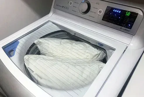 Hvor du hviler på hovedet om natten kan være fuld af svamp - nogle kan være farlige for dem med astma. Hvis din pude - selve den fluffy ting - kan vaskes, gør det mindst to gange om året. Følg plejemærket om, hvordan man gør det. Sørg for at skylle og tørre det godt for at forhindre meldug. Hvis du bruger en pudebeskytter, skal du kaste den i vasken sammen med din pudebetræk.