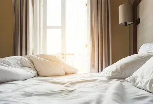 Du har måske hørt, at den bedste måde at sparke start din dag på er at lave din seng. Men det kan være klogt at ikke skynde sig. Det skyldes, at fugt bygger i dine lagner efter hver nat med sludder. Når du vågner op, skræl dækslerne tilbage og giver din seng en chance for at tørre. Det gør det til et mindre attraktivt hekkeplads for bakterier og mider.