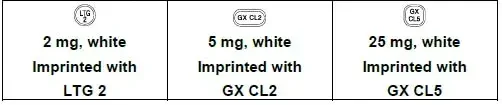 Disse billeder viser de forskellige ordlydfarver og former for tabletterne, der hjælper med at identificere den rigtige styrke af lamictal tabletter tabletter til oral suspension og oralt opløsning af tabletter. Ring straks din farmaceut, hvis du modtager en Lamictal -tablet, der ikke ligner en af tabletterne, der er vist nedenfor, da du måske har modtaget den forkerte medicin.