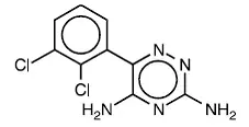 LAMICTAL (lamotrigine) an AED of the phenyltriazine class is chemically unrelated to existing AEDs. Lamotrigine's chemical name is 35-diamino-6-(23-dichlorophenyl)-as-triazine its molecular formula is C 9 H 7 N 5 Cl 2 og dens molekylvægt er 256,09. Lamotrigin er et hvidt til bleg cremefarvet pulver og har en PKA på 5,7. Lamotrigin er meget lidt opløselig i vand (NULL,17 mg/ml ved 25 ° C) og let opløselig i 0,1 M HCI (NULL,1 mg/ml ved 25 ° C). Den strukturelle formel er: