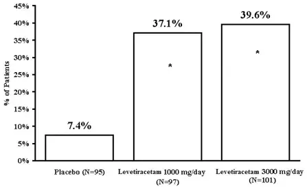 Den primære måling af effektiviteten var den procentvise reduktion fra baseline i ugentlig PGTC -anfaldsfrekvens for levetiracetam og placebo -behandlingsgrupper over behandlingsperioden (titreringsevalueringsperioder). Der var et statistisk signifikant fald fra baseline i PGTC-frekvens hos de levetiracetam-behandlede patienter sammenlignet med de placebo-behandlede patienter.