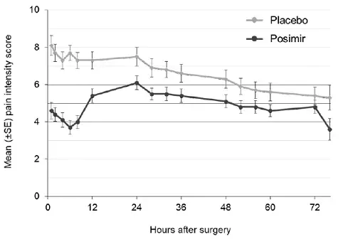 De primære resultatmål var det normaliserede område under kurven (NAUC) af gennemsnitlig smerteintensitet på bevægelsesscore indsamlet med specificerede intervaller i løbet af de første 72 timer efter operationen og total opioid rednings analgesi (IV morfin-ækvivalent dosis) gennem 72 timer. I denne kliniske undersøgelse demonstrerede Posimir 5 ml en signifikant reduktion i gennemsnitlig smerteintensitet sammenlignet med placebo på 1,3 point på en 0 til 10 NRS -skala over 72 timer (figur 1).