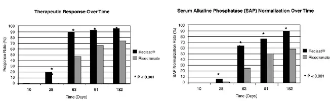 De 6-måneders kombinerede data fra begge forsøg viste, at 96% (169/176) af genlast-behandlede patienter opnåede en terapeutisk respons sammenlignet med 74% (127/171) af patienter behandlet med Risedronate. De fleste tilbagebetalingspatienter opnåede en terapeutisk respons ved besøg på dag 63. Derudover ved 6 måneder opnåede 89% (156/176) af genlast-behandlede patienter normalisering af SAP-niveauer sammenlignet med 58% (99/171) af patienter, der blev behandlet med Risedronate (P <0.0001) (see Figure 2).