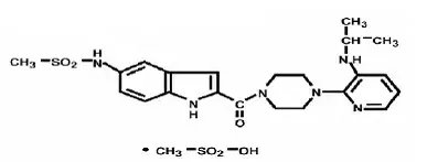 Rescriptor-tabletter indeholder delavirdin mesylat en syntetisk ikke-nukleosid omvendt transkriptaseinhibitor (NNRTI) af den humane immundefektvirus type 1 (HIV-1). Det kemiske navn på delavirdin-mesylat er piperazin 1- [3-[(1-methyl-ethyl) amino] -2- pyridinyl] -4-[[5-[(methylsulfonyl) amino] -1H-indol-2-yl] carbonyl]-monomethanesulfonat. Dens molekylære formel er C 22 H 28 N 6 O 3 S • CH 4 O 3 S og dens molekylvægt er 552,68. Den strukturelle formel er: