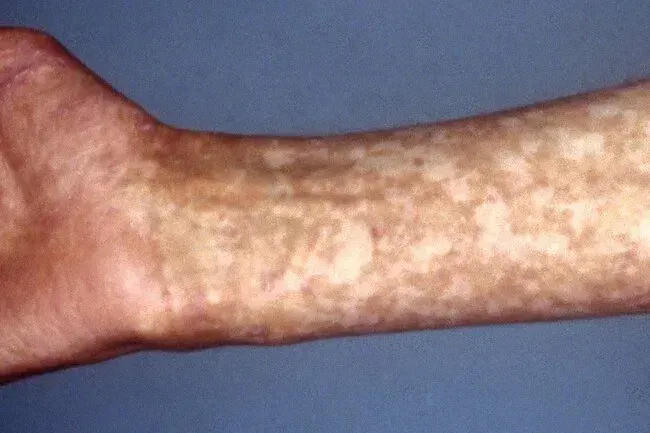Morphea is a skin condition that causes red white or hard painless patches on your skin. If you have a serious case that covers much of your body the doctor might prescribe ultraviolet light to ease your symptoms.