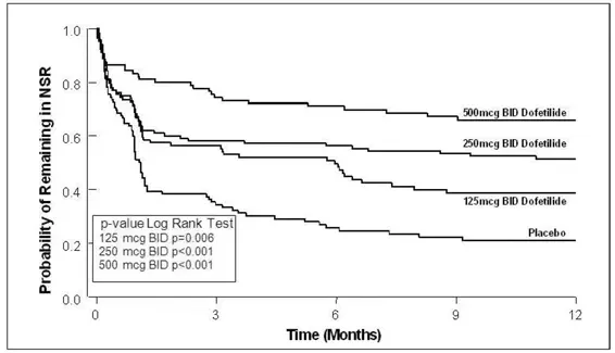 Punktestimaterne for sandsynligheden for at forblive i NSR efter 6 og 12 måneder var henholdsvis 62% og 58% for Tikosyn 500 mcg -bud; Henholdsvis 50% og 37% for Tikosyn 250 MCG -bud; og henholdsvis 37% og 25% for placebo.