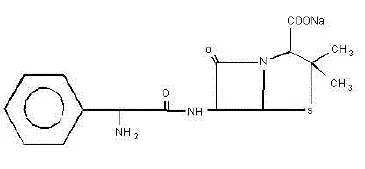 Ampicillin-natrium er afledt af penicillin-kernen 6-aminopenicillansyre. Kemisk er det Monosodium (2S 5R 6R) -6-[(R) -2-amino-2-phenylacetamido] -3 3-dimethyl-7-oxo-4-thia-1-azabicyclo [3.2.0] heptan-2-carboxylat og har en molekylær vægt på 371.39. Dens kemiske formel er C 16 H 18 N 3 De 4 S. Den strukturelle formel er: